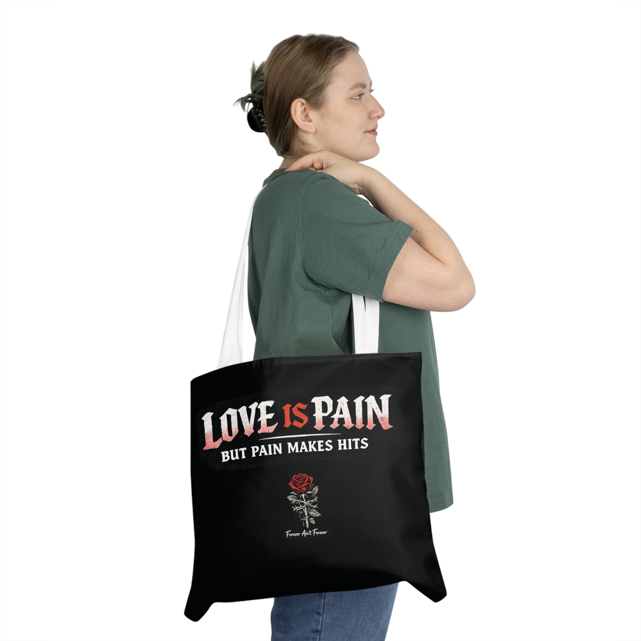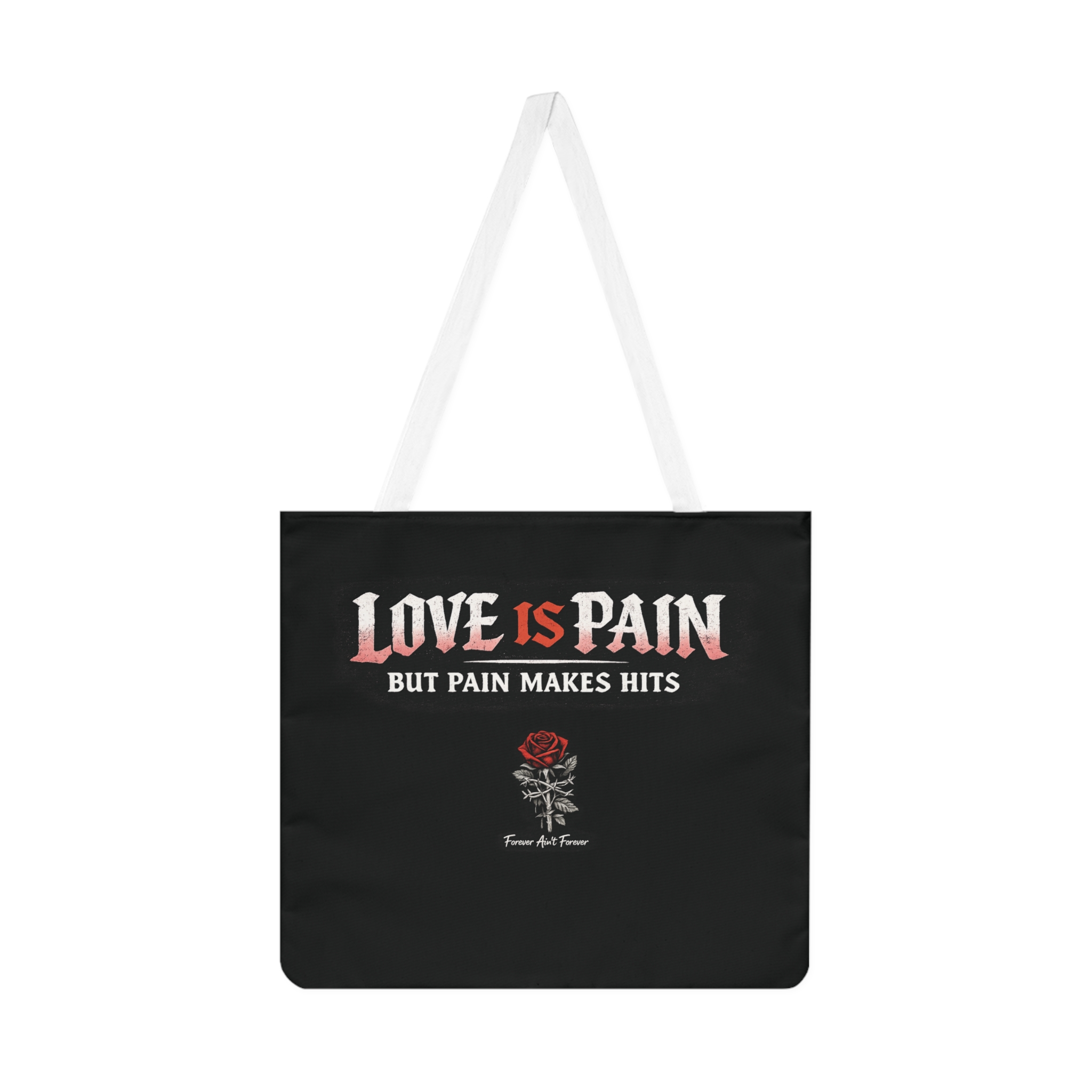 A black cotton shoulder tote printed with a bold, music-inspired slogan and a single red rose. The design places the phrase “LOVE IS PAIN” in distressed, vintage rock lettering above a smaller line that reads “BUT PAIN MAKES HITS,” with a delicately sketched rose below. The contrast of the stark black canvas and white handles keeps the look edgy but wearable. Lightweight and softly structured, this tote carries daily essentials while signaling an offbeat, emotional aesthetic—great for gigs, record shopping, or carrying notebooks and a water bottle. Reinforced handle stitching and all-over printing mean it holds up to regular use without losing its graphic impact.