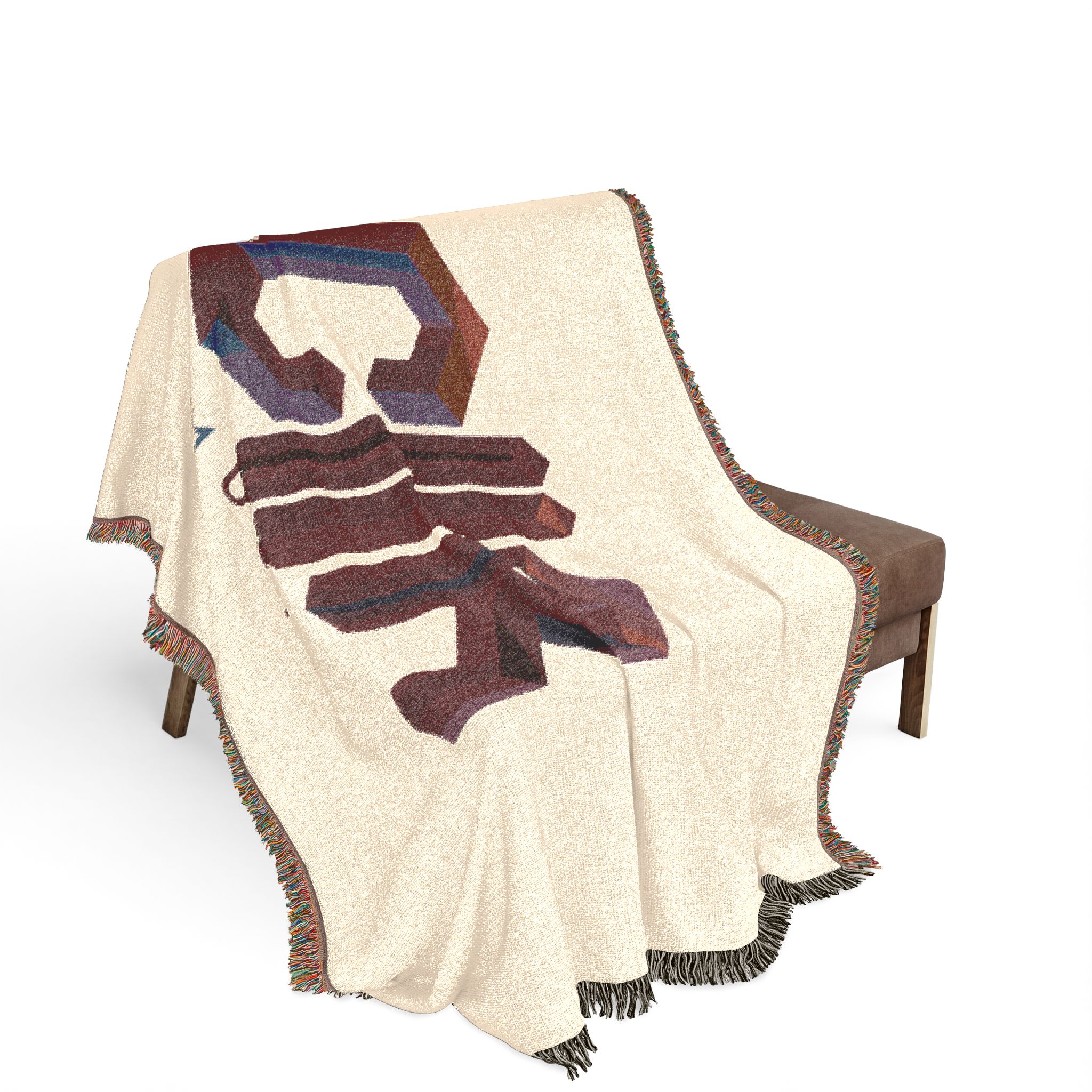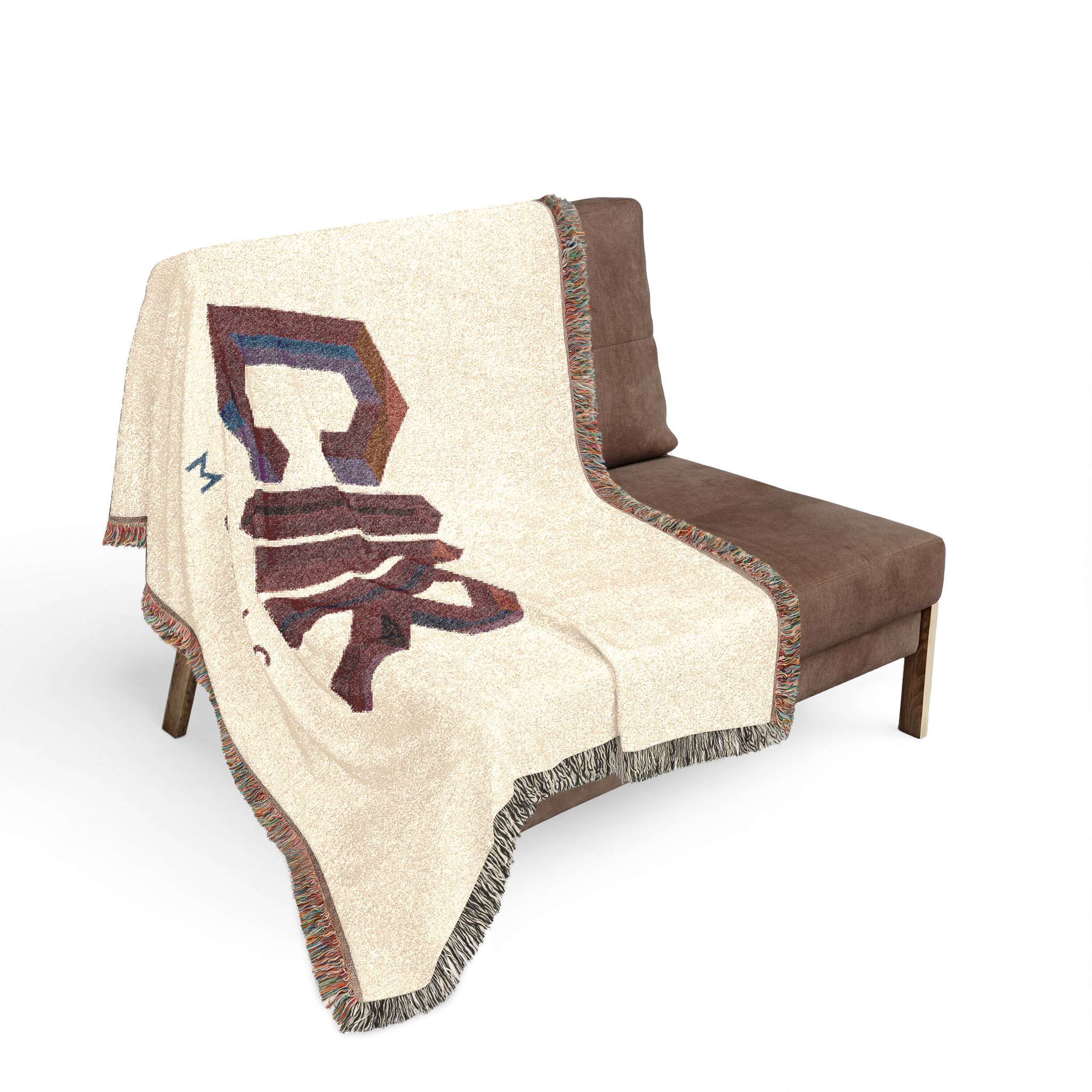 This woven blanket brings bold graphic energy into cozy moments. Woven threads form a retro geometric logo that reads as mirrored, dimensional lettering, set against either a warm cream or deep charcoal ground. Colorful fringed edges add a handcrafted touch and frame the design like a finished tapestry. The blanket drapes naturally over couches, shoulders,…